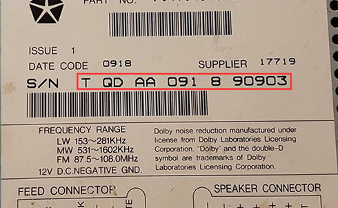 There are different types of chrysler serial numbers, or as called sometimes the "security code". These are located on the top or side of the car stereo box or printed on the label. As the example shows, this is the information needed to generate the correct car radio unlocking code for you. An example of this would be "TQ1AA2959A7235", Please see the images below for reference.